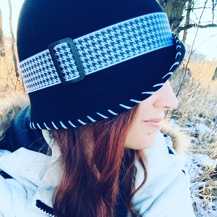Ladies black wool felt cloche, black and white houndstooth band with buckle, size medium (23 inches)