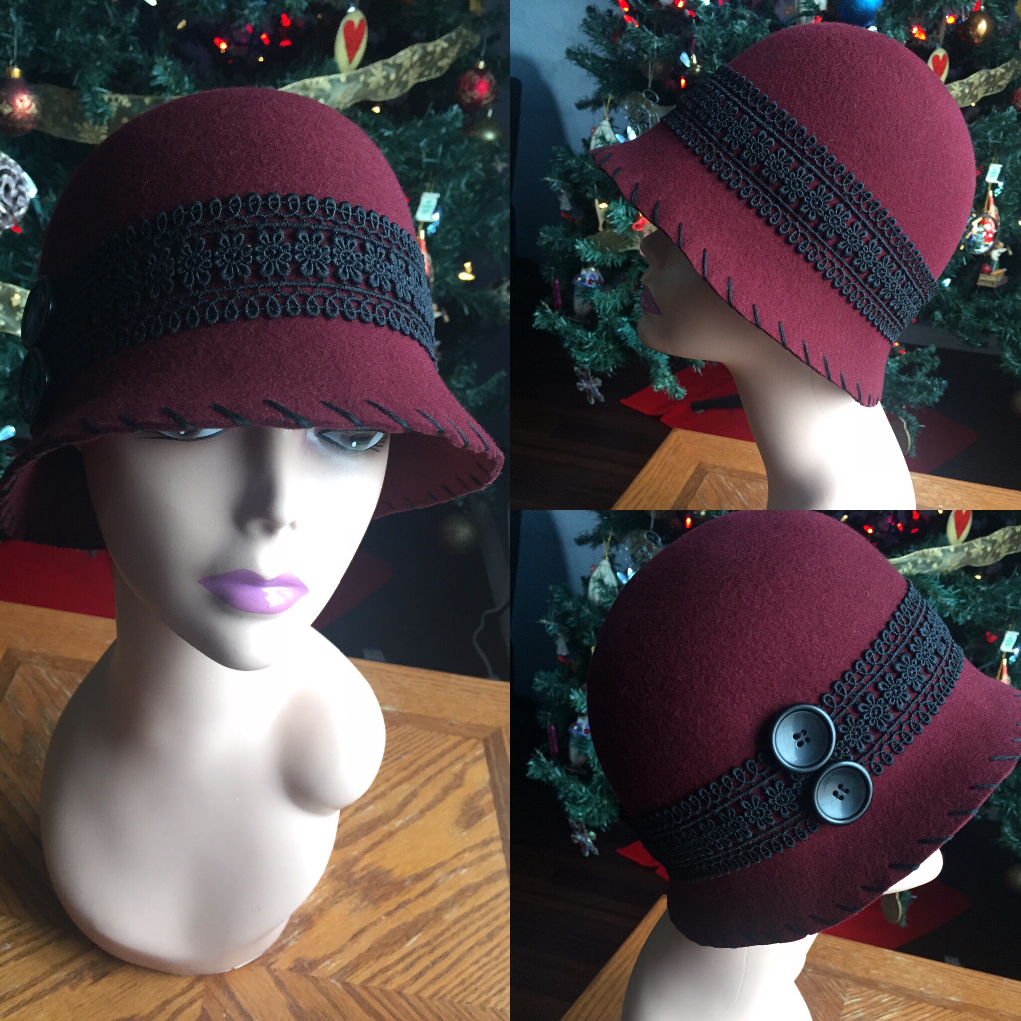 Ladies burgundy wool felt cloche with black lace band, size small (22 inches)