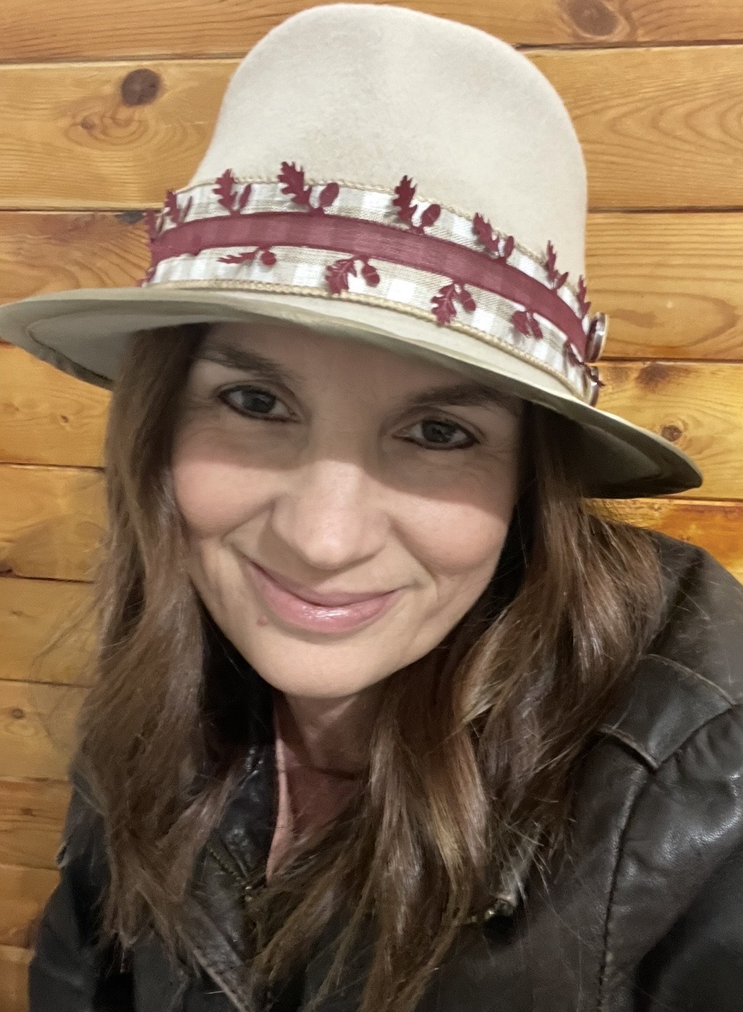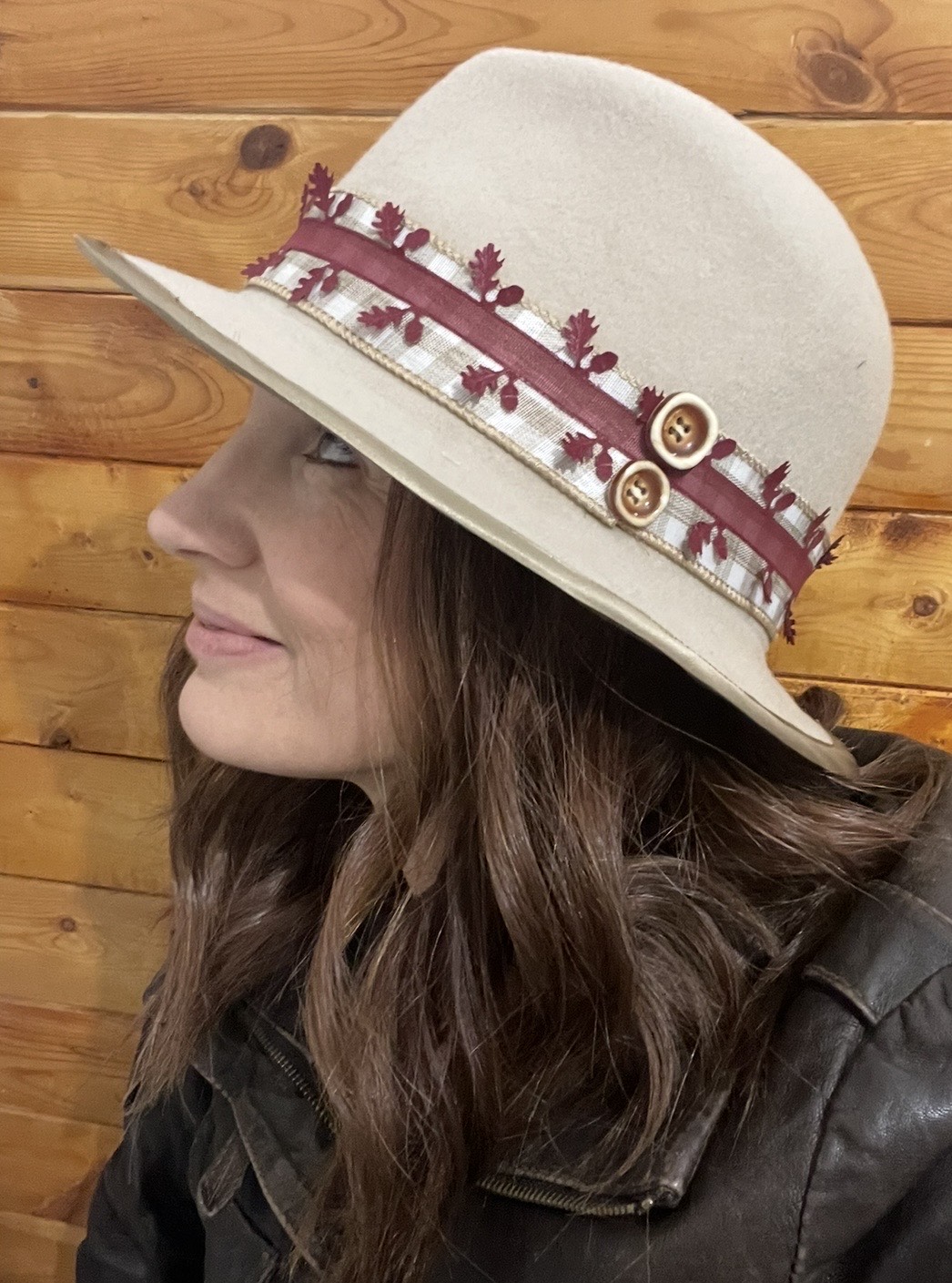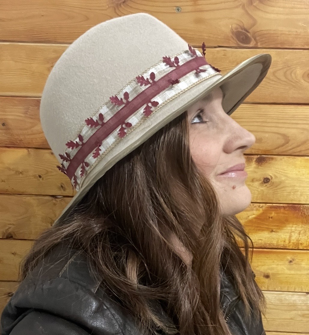 Camel wool felt fedora, white and tan coloured band with burgundy lace, two buttons, size medium, approximately 23 inches