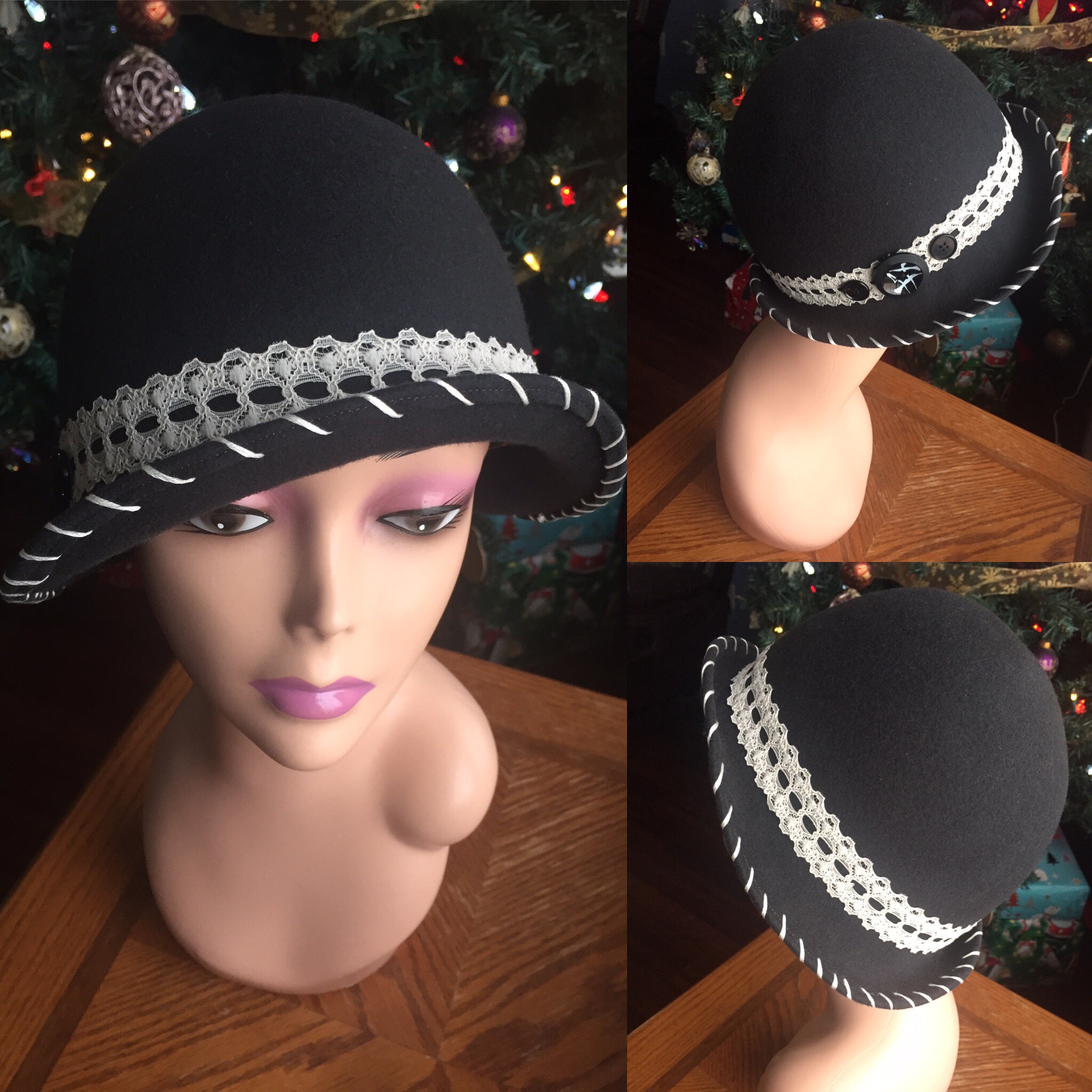 Ladies dark grey wool felt cloche, lace band, size medium (23 inches)
