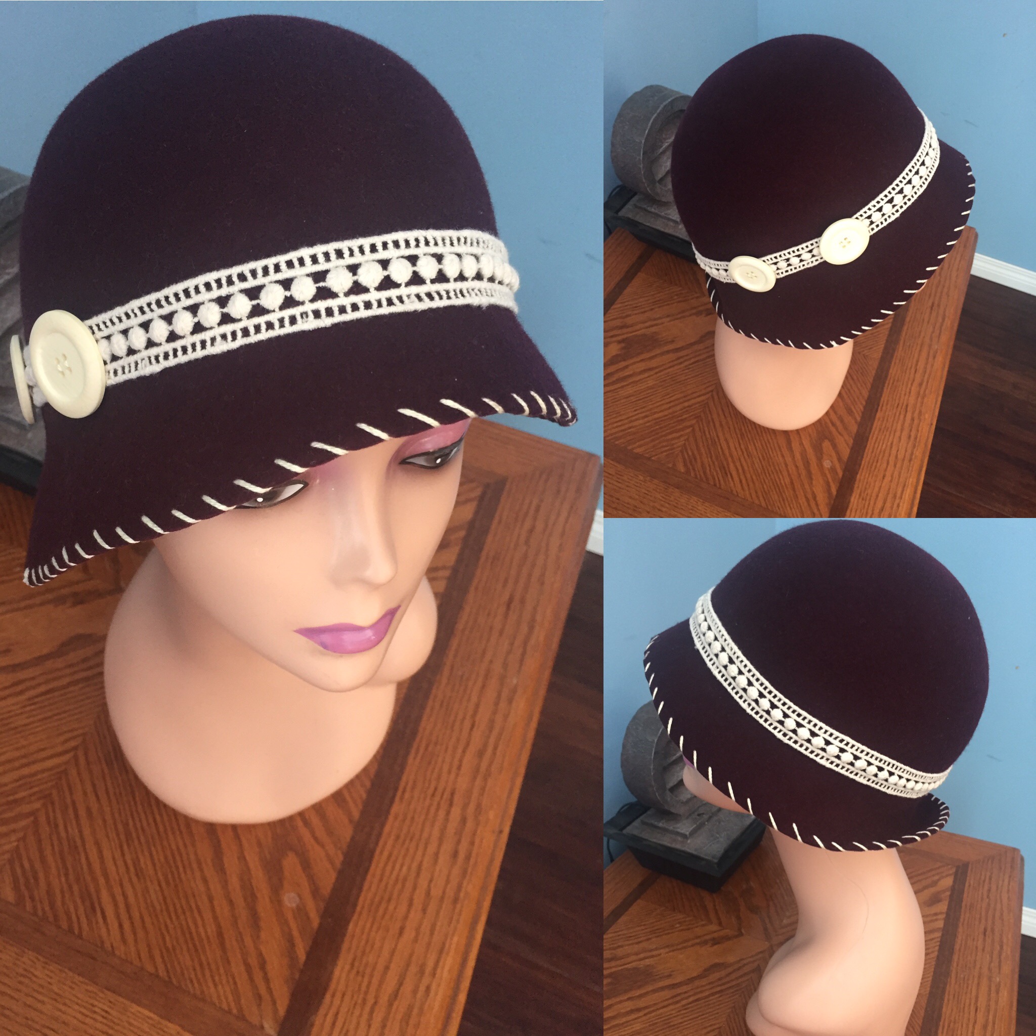 Ladies dark plum wool felt cloche, lace band, size small (22 inches)