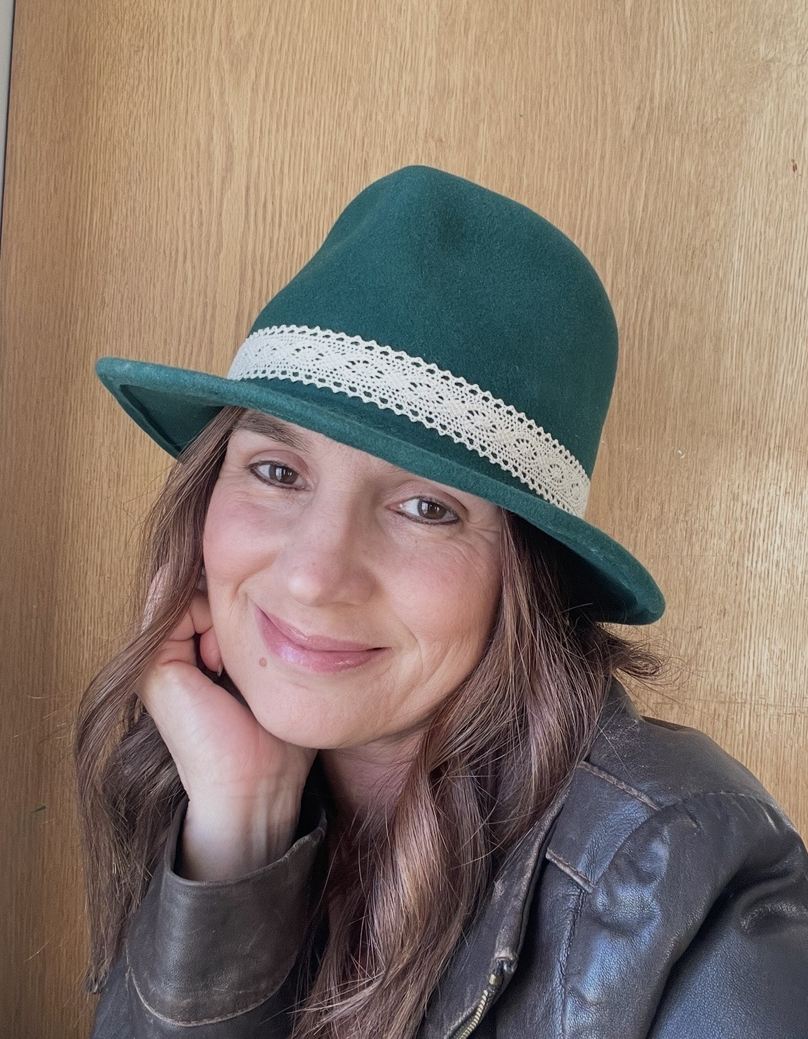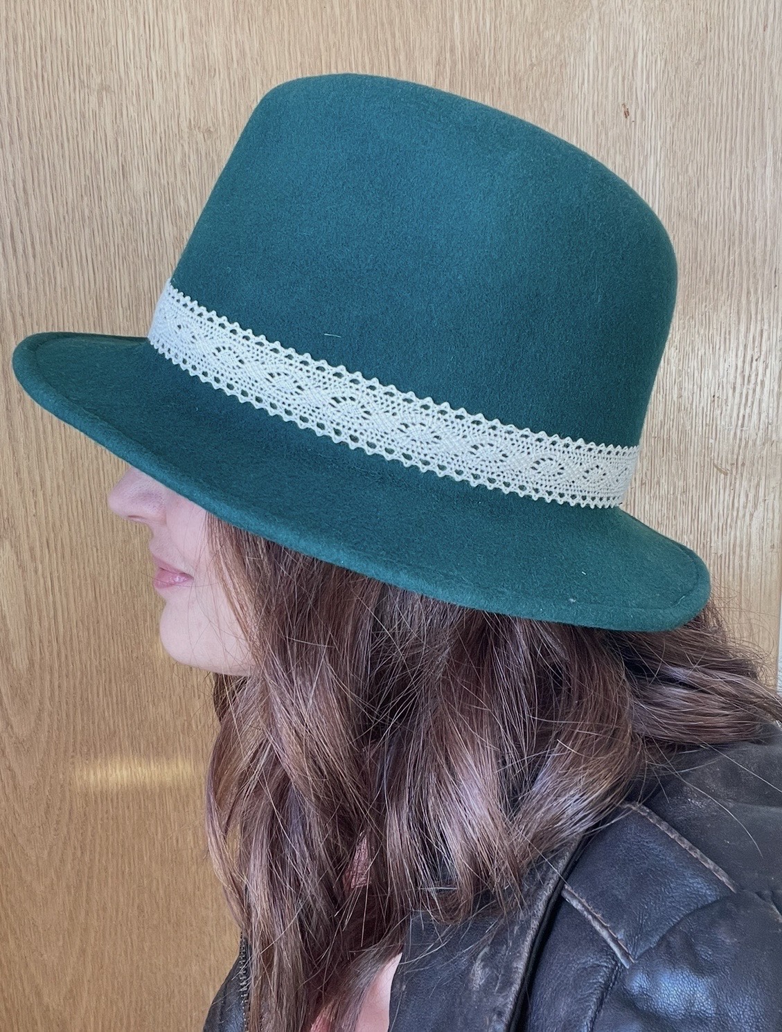 Forest Green Fedora, Beige Lace Band, 123h