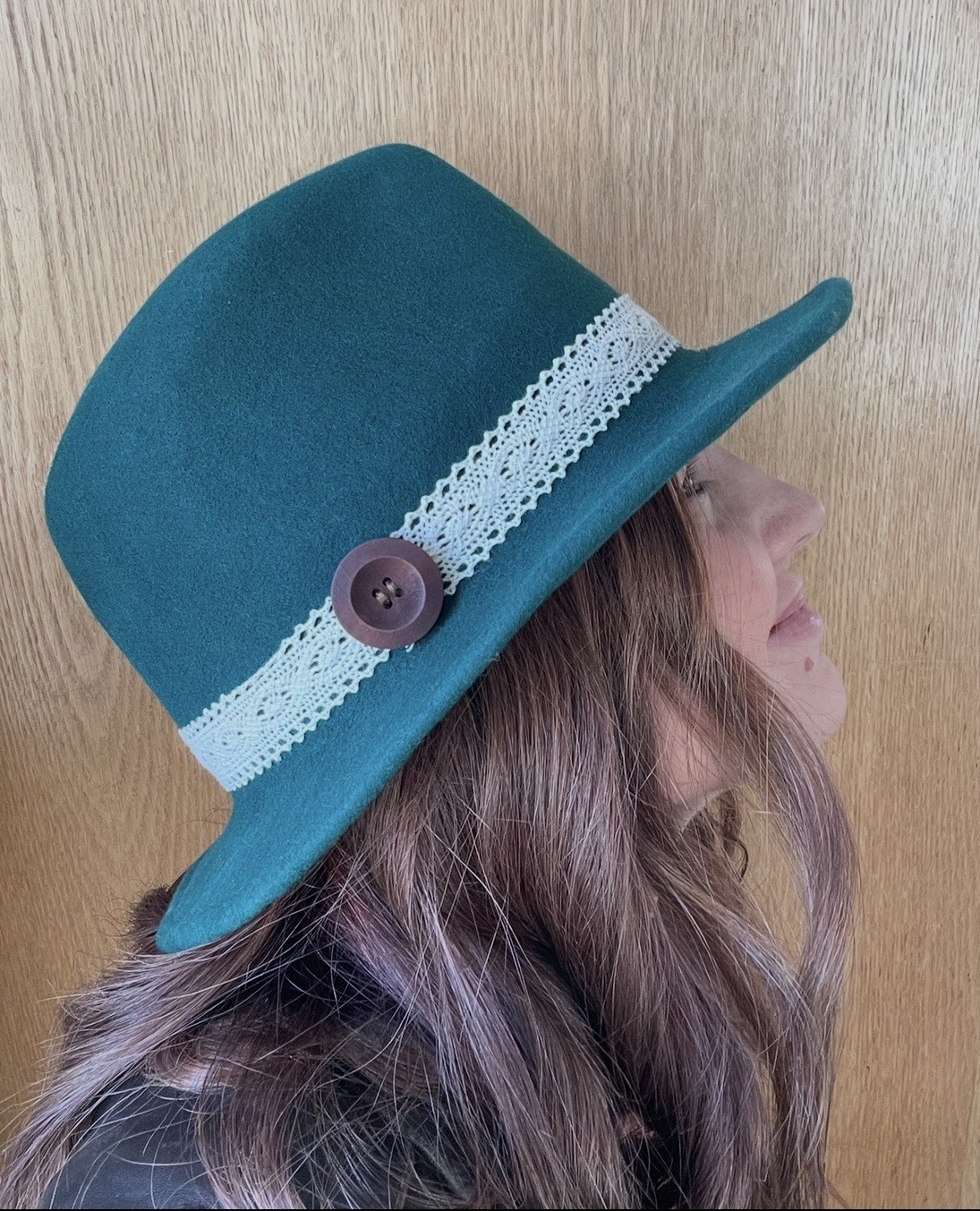 Forest green fedora with a beige lace band, one button. Size small (approximately 22 inches)