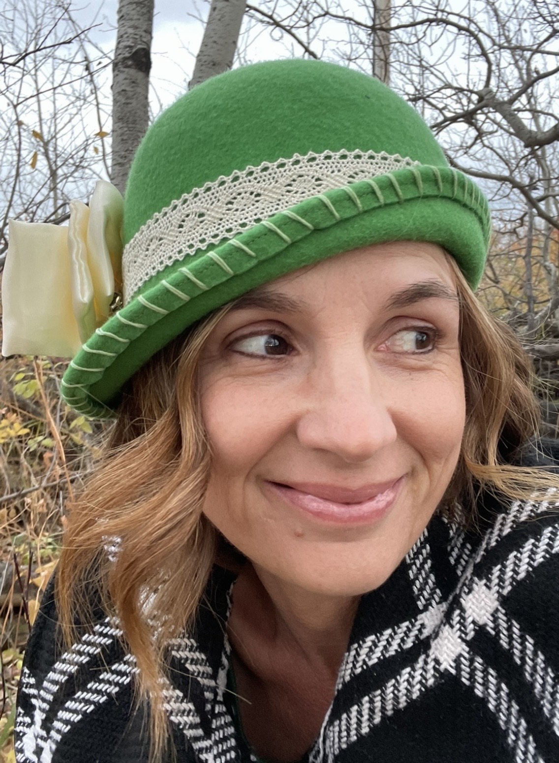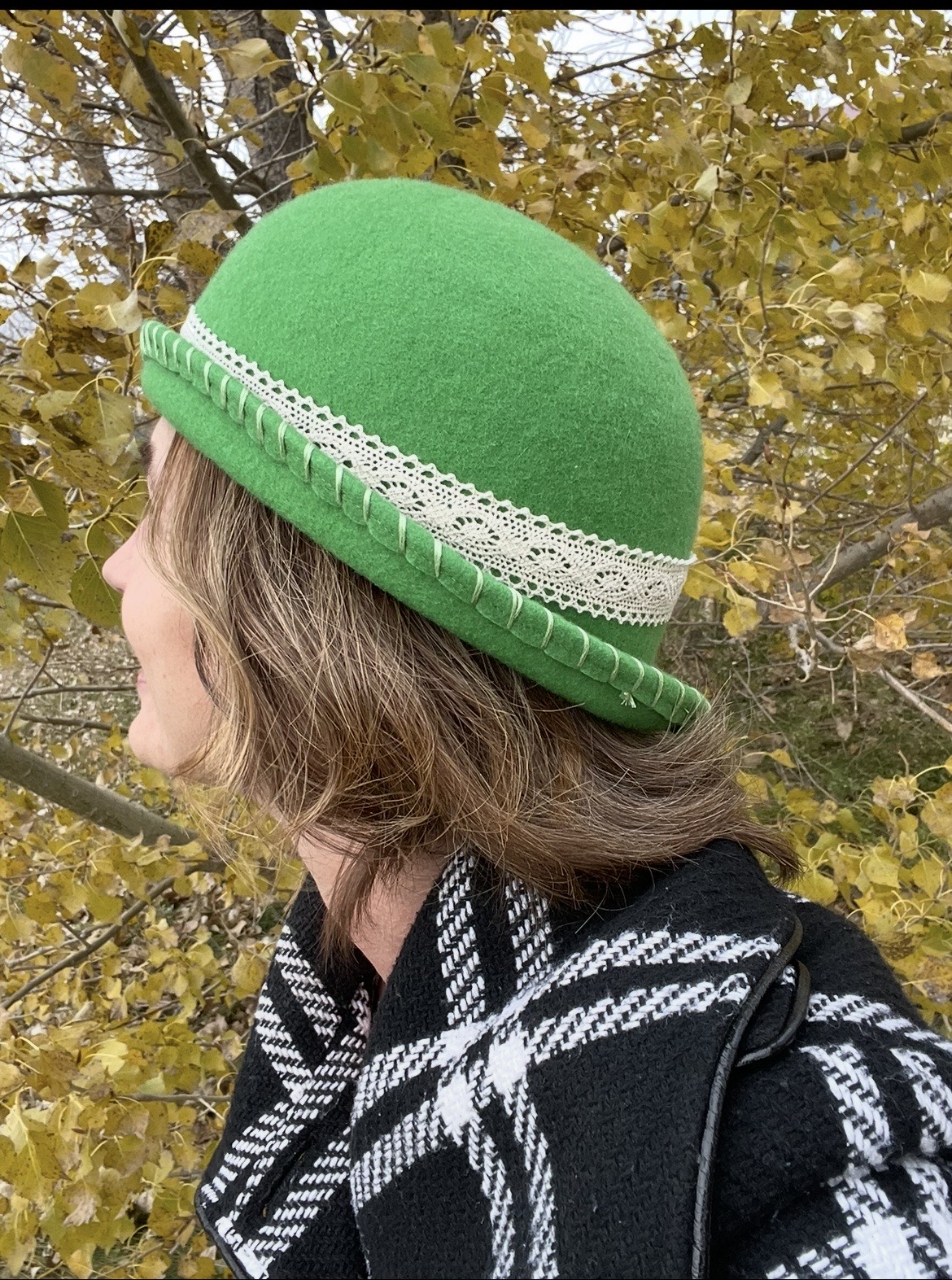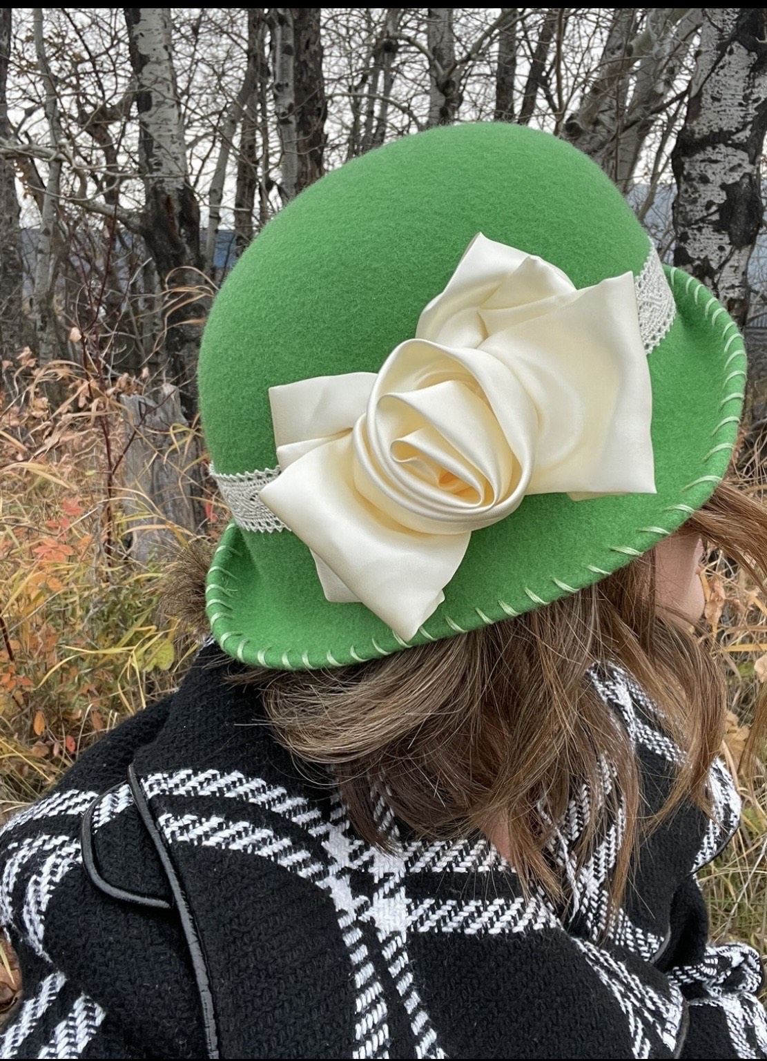 ladies emerald green cloche, beige lace band with cream-coloured satin bow, size small (approximately 22 inches)
