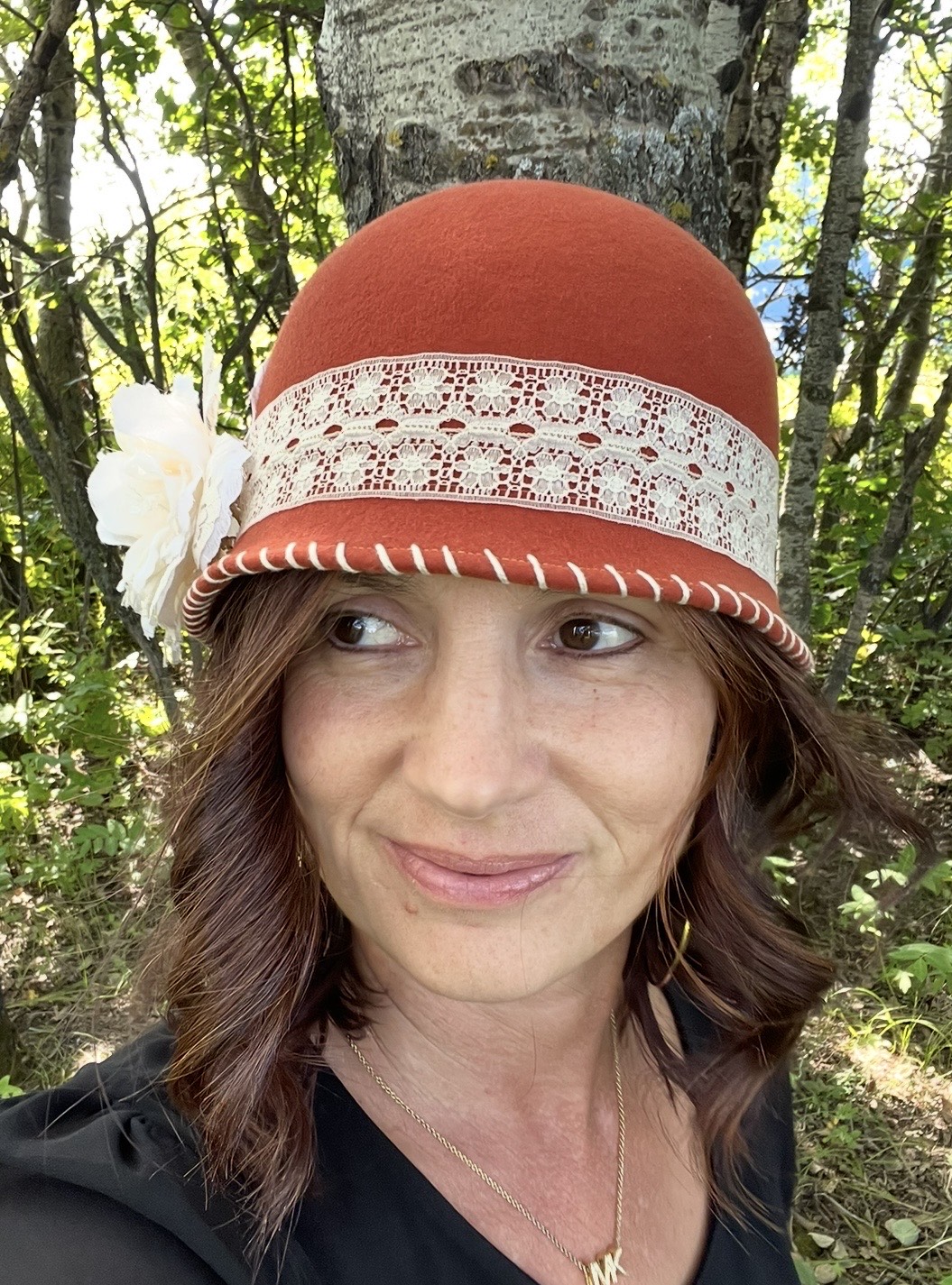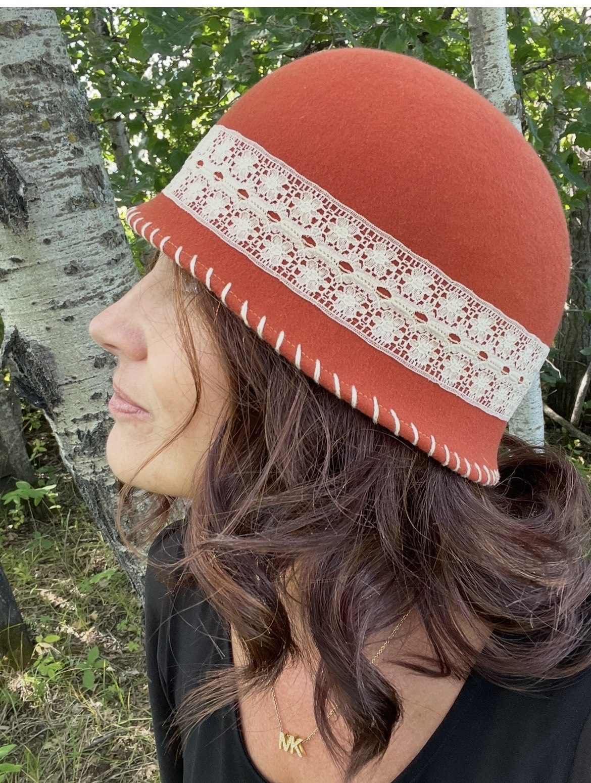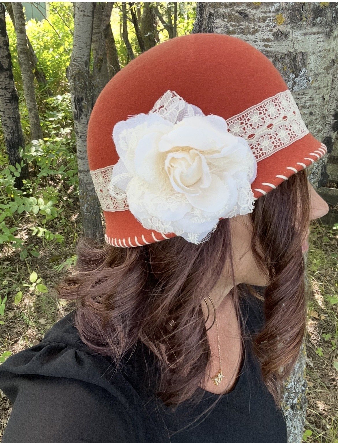 Ladies orange cloche, beige lace band with beige flower, size small (approximately 22 inches)