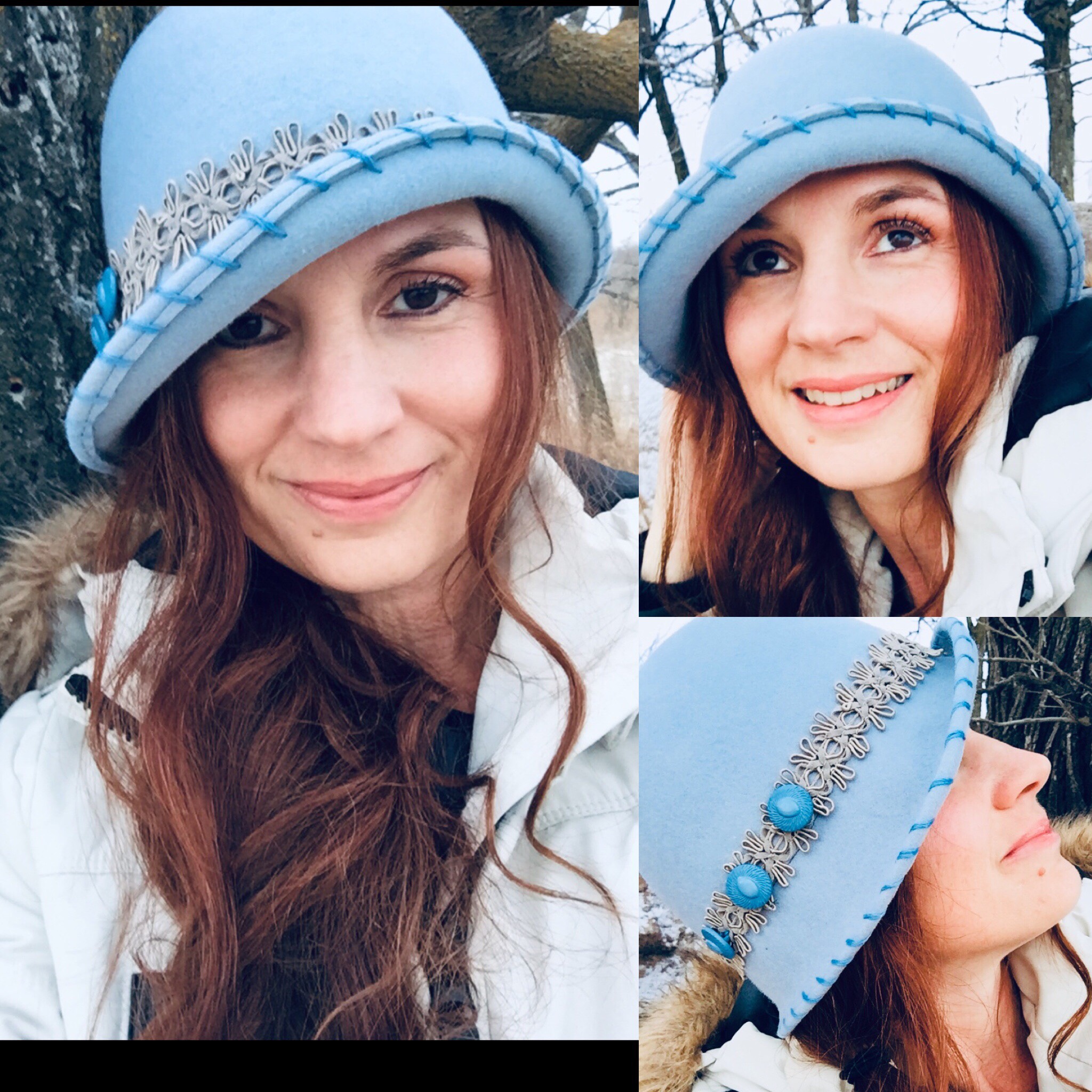 Ladies light blue wool felt cloche, elastic lace band, size small (22 inches)