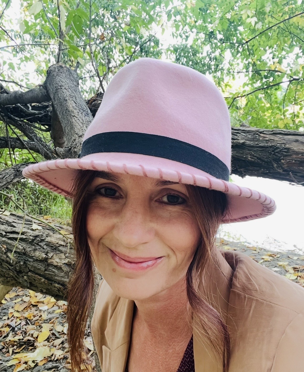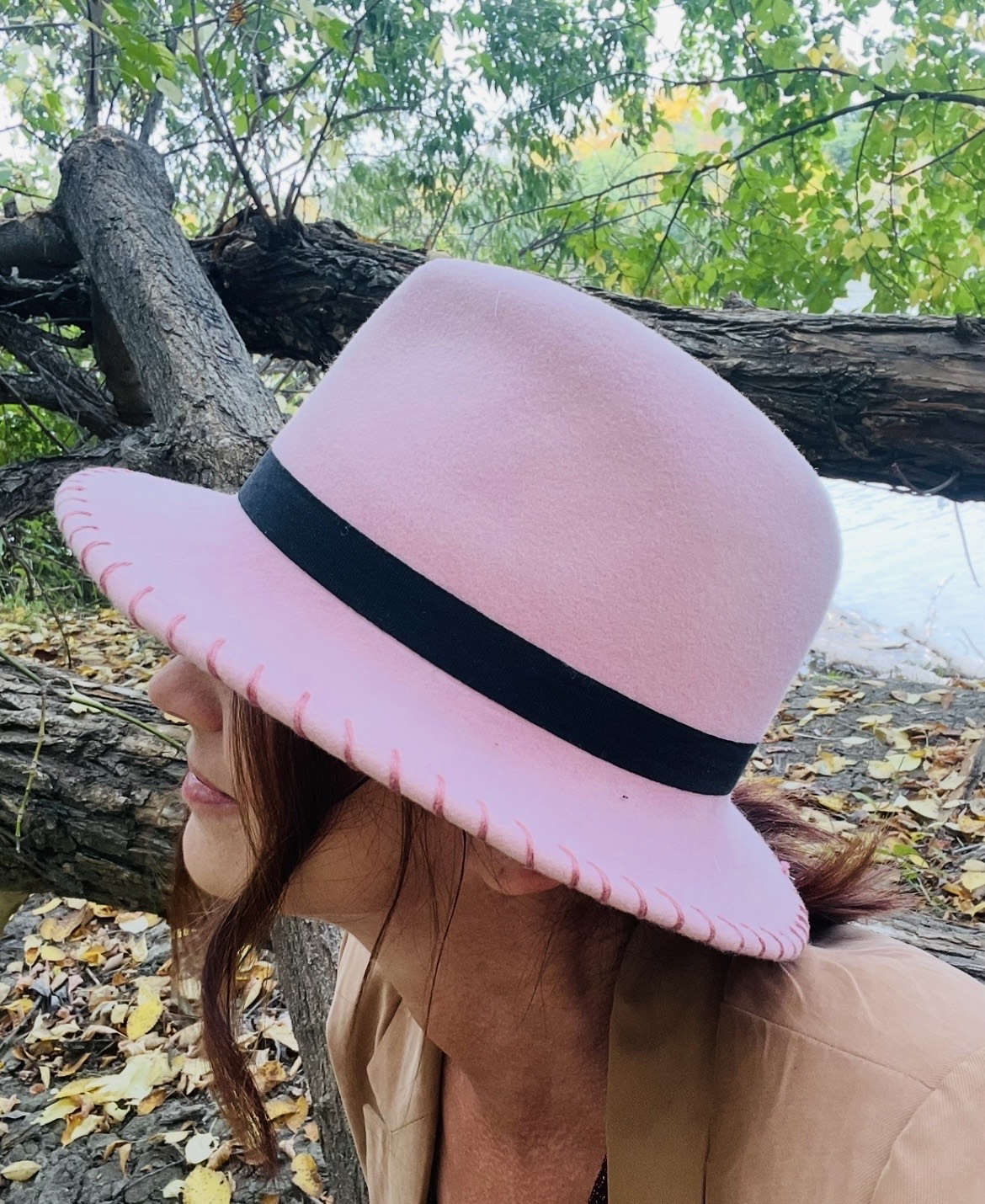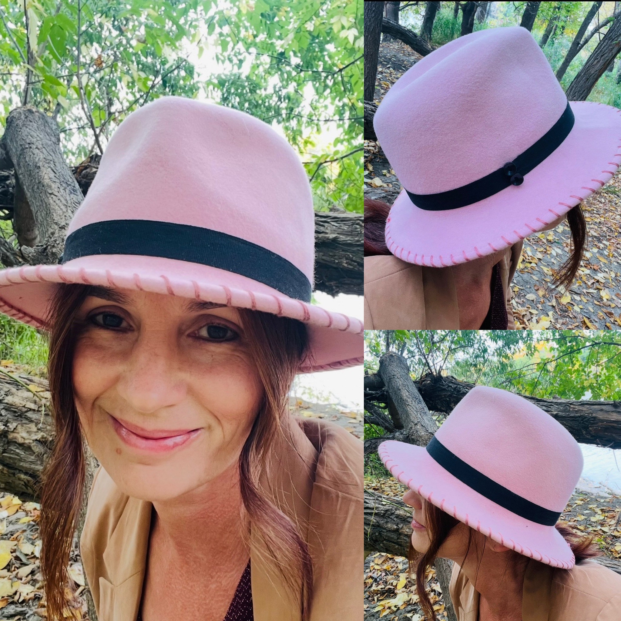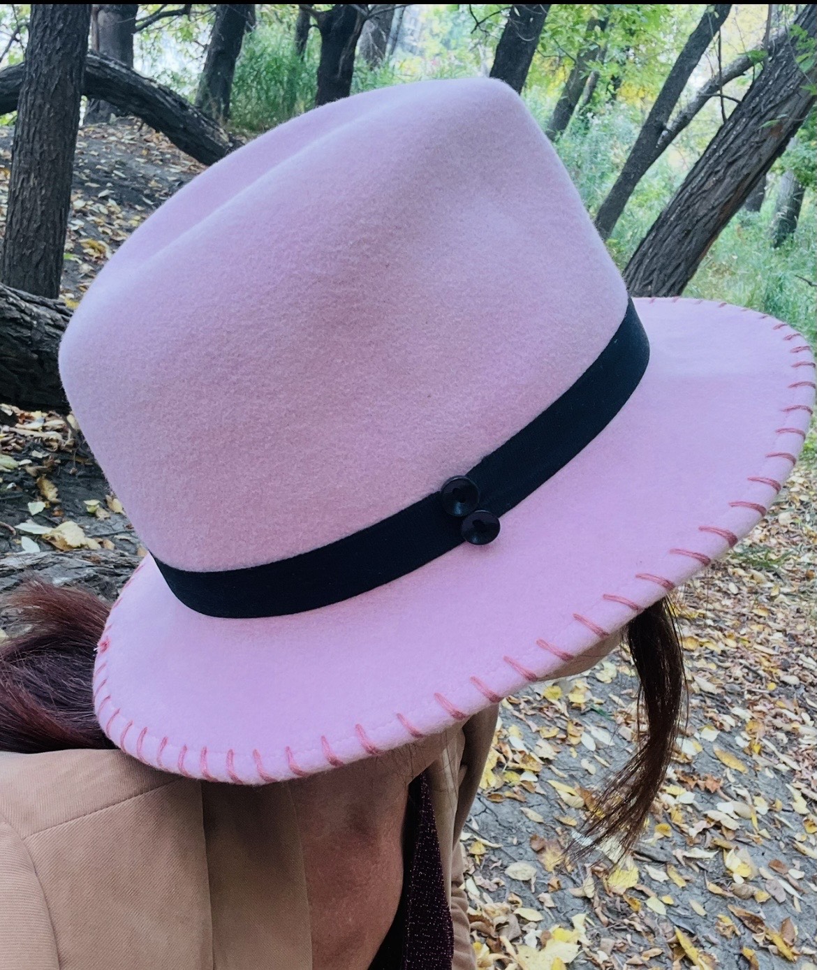 Ladies size small (approximately 22 inches) pink fedora, black ribbon, two black buttons
