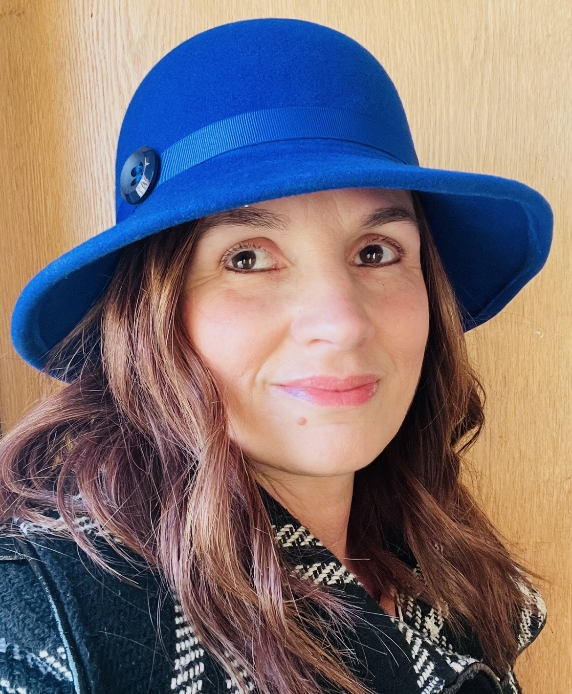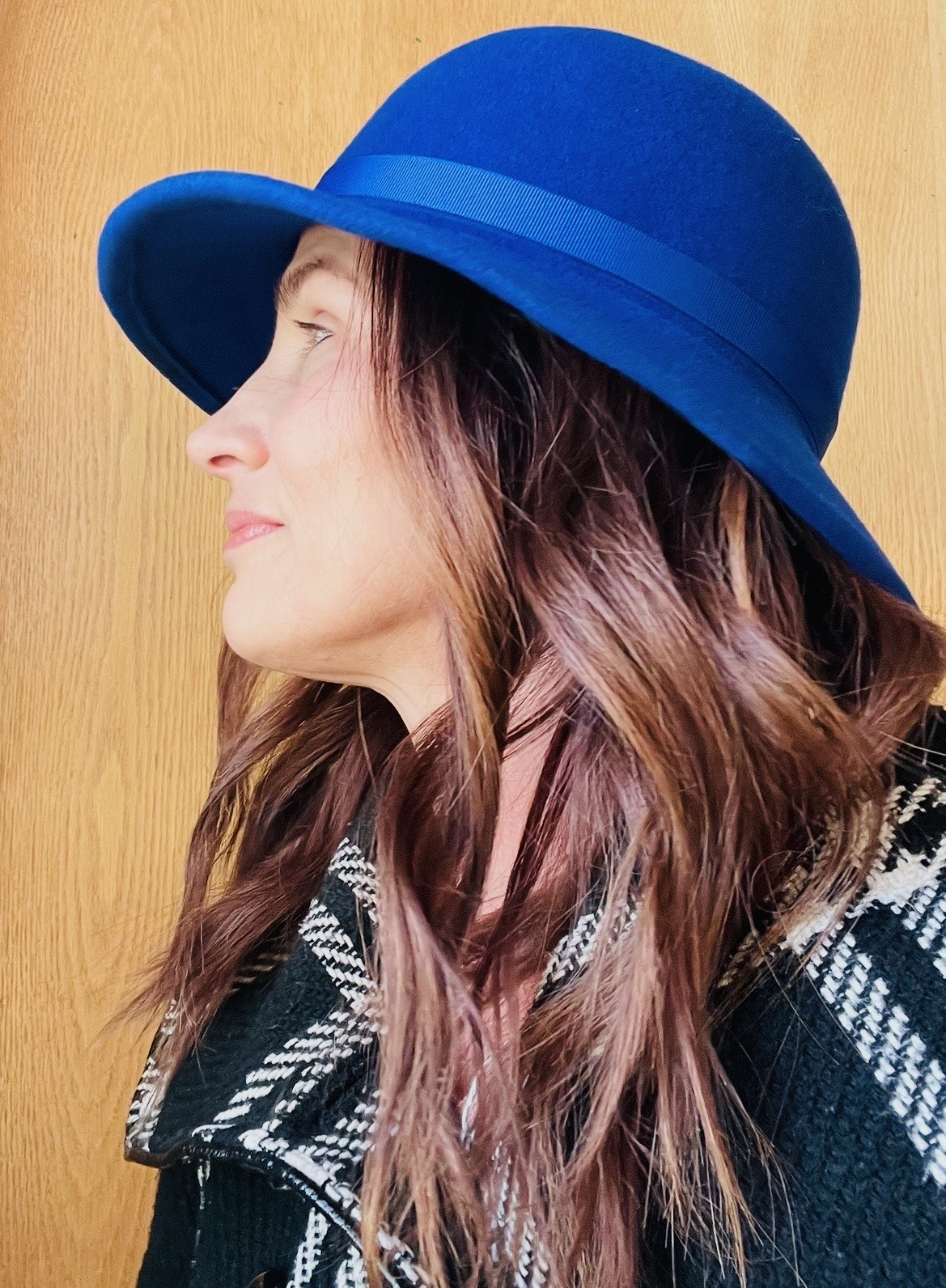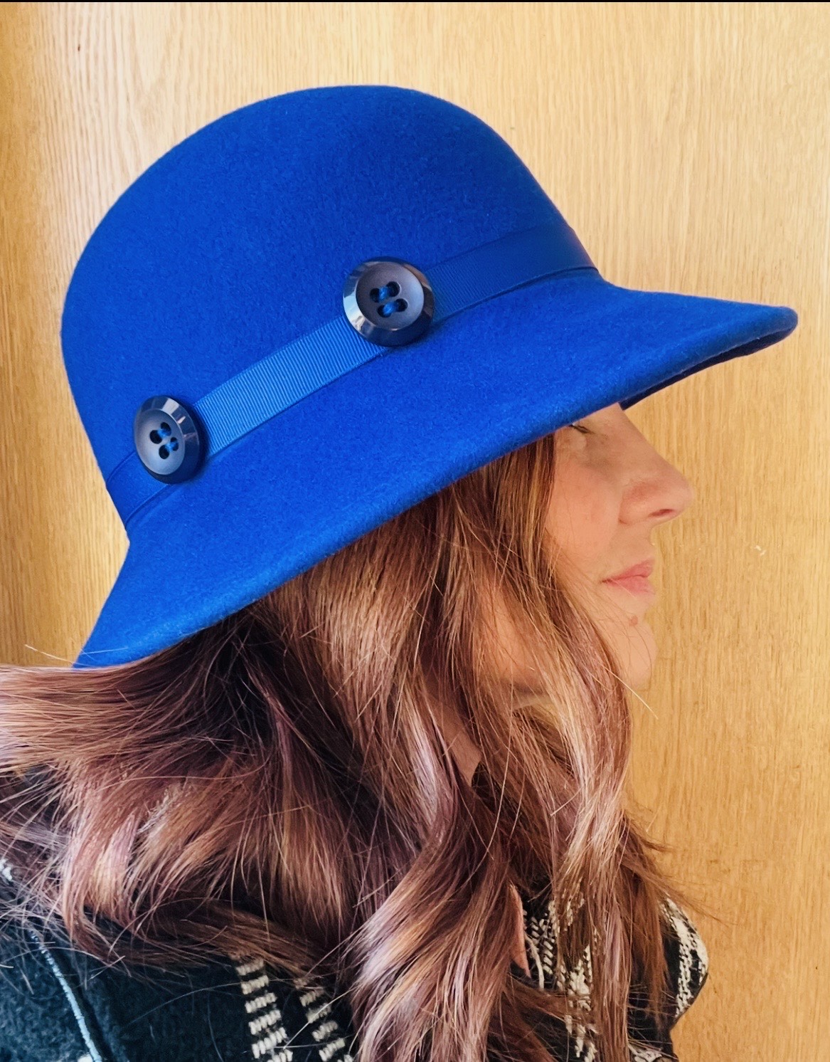 Ladies' wool felt royal blue wide-brimmed hat, narrow blue band, two buttons, size small (approximately 22 inches)